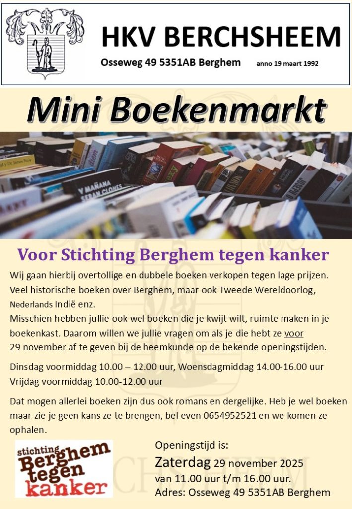 Wij gaan hierbij overtollige en dubbele boeken verkopen tegen lage prijzen. Veel historische boeken over Berghem, maar ook Tweede Wereldoorlog, Nederlands Indië enz.